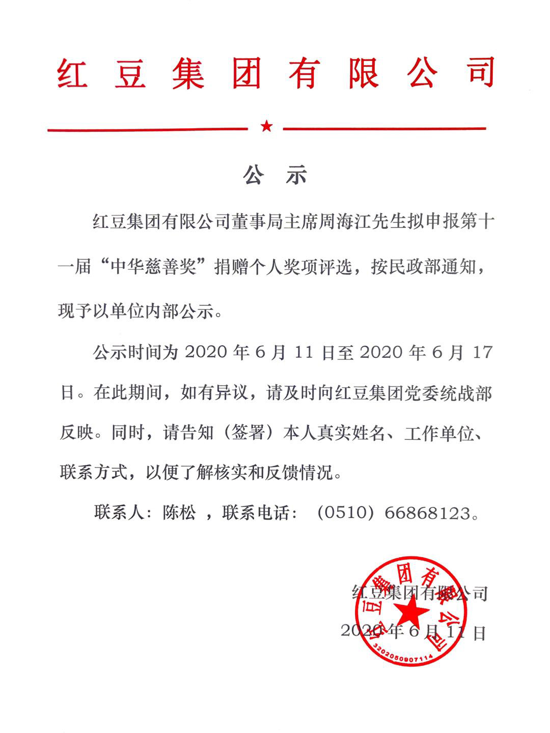 关于红豆集团董事局主席周海江申报第十一届“中华慈善奖”捐赠个人奖项评选的公示