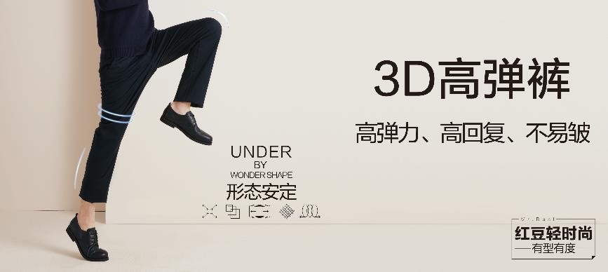 不知道该怎么选择裤子?不知道自己适合什么版型?红豆男装的这款裤子可以为你解决以上问题。3D高弹裤是红豆男装的经典热卖款,高弹力无束缚的舒适穿着体验,让这款裤子成为红豆男装门店的明星产品。在深受欢迎的同时,红豆男装精益求精,在第二代的基础上进行改良升级,即将推出第三代3D高弹裤。高弹力、高回复、不易皱,第三代3D高弹裤经过层层打磨、细节推敲、不断优化,只为打造经典,彰显舒适与品质。