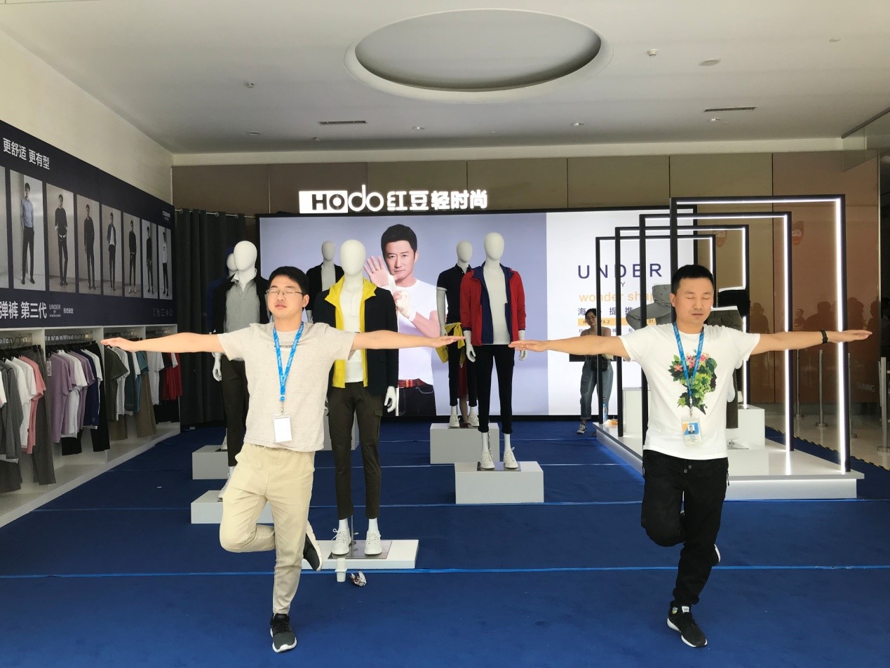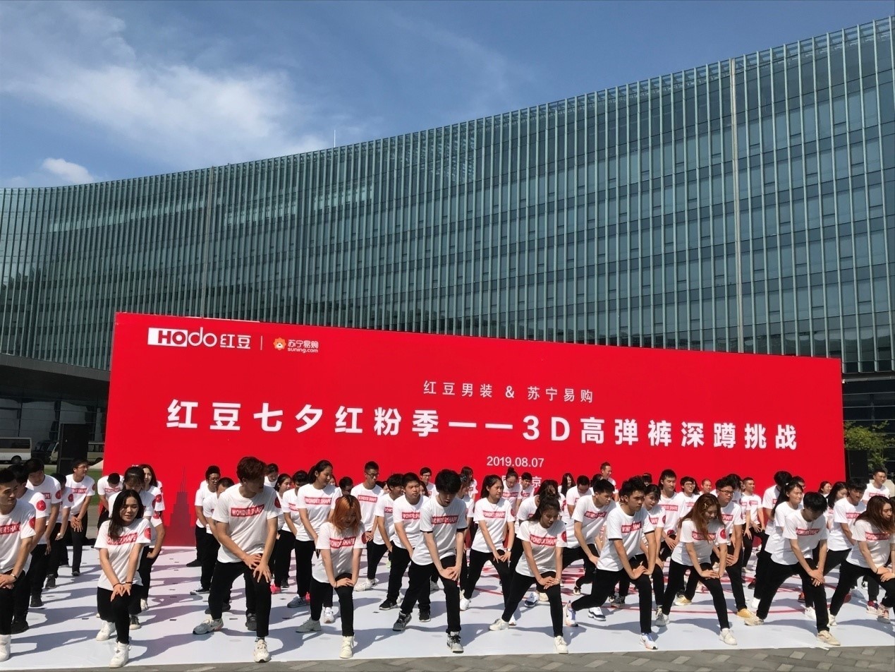 内场的发布会全面启动线上销售,而外场深蹲挑战是一场对高弹裤的探索,将会颠覆你对裤子的认知,通过切身体验产品的形式更直观地展现了第三代红豆3D高弹裤的高弹力、回复性与舒适度。深蹲挑战还融合了七夕的主题,77对情侣在七夕这一天身穿红豆3D高弹裤,默契搭档挑战深蹲,在音乐的变换中完成指定动作,深蹲、弓步、抬腿……他们挑战自我、配合默契,突破传统裤子对身体的束缚,在展现3D高弹裤产品优点的同时,增强彼此间的互动,也为这场挑战增添了甜蜜与浪漫。这场有趣的挑战更像是一次情侣间默契度的考验,也将会成为他们难忘的七夕体验。红豆的匠心产品与苏宁平台相结合,在七夕这个特殊的日子里,集结红粉与77对情侣,用别具一格的深蹲挑战形式演绎经典产品的全新面貌。