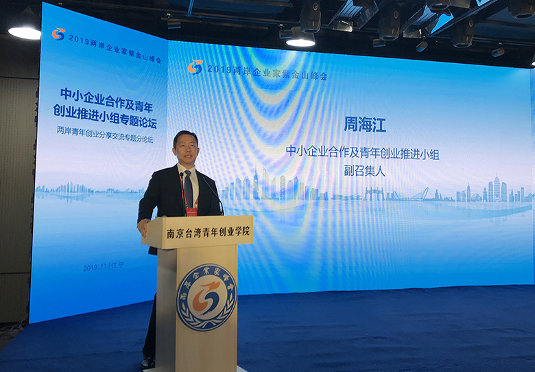 11月4-5日,2019两岸企业家紫金山峰会在江苏南京举行。中共中央政治局常委、全国政协主席汪洋出席并发表演讲。作为两岸企业家峰会中小企业合作和青年创业推进小组召集人的红豆集团董事局主席兼CEO周海江,在两岸青年创业分享交流专题论坛上,鼓励台湾青年精英来大陆创业,并分享了自己创业的故事。