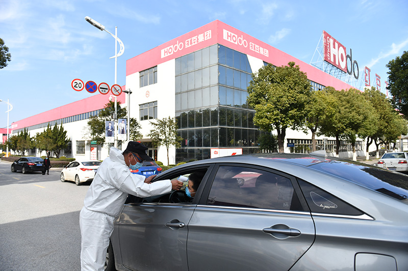 “为了确保工人安全和生产正常进行,我们严格遵守当地复工要求,对所有复工的职工进行摸底调查,确保复工职工及家人没有重点疫区人员接触史。本地员工先复工,针对返回的外地员工,全部隔离观察14天,再做相应工作安排”红豆集团相关负责人表示。记者看到,在红豆集团厂区及生产车间,所有复工的职工均佩戴口罩,进出测量体温;厂区、车间、食堂、宿舍等区域每天定时消毒;所有防疫物资均以准备充足,包括耳温枪、洗手液、口罩、防护服、84消毒液、酒精等,千方百计保护好每一位职工的平安健康。