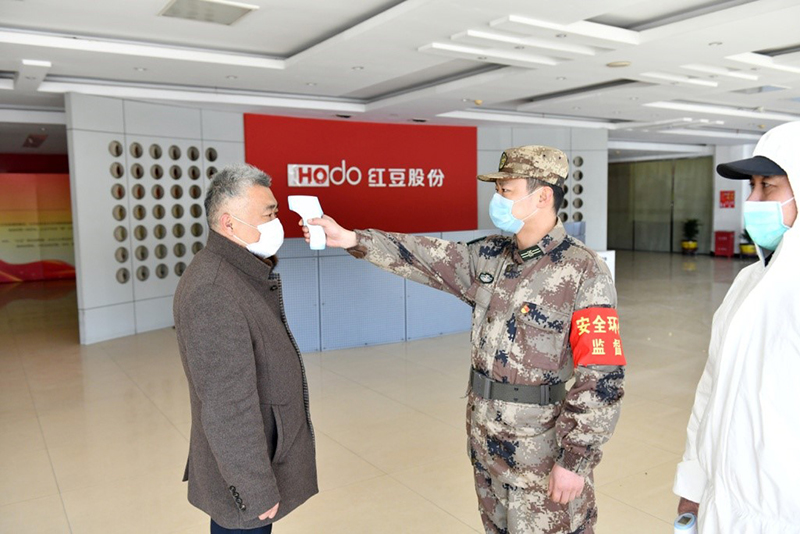 谢军,是这次红豆防护服生产大楼的安全生产负责人,也是一名退役军人,他每天都要对进入大楼的员工进行排查,检测好生产工人的体温。每天早晨7点,他已站在大楼门口,面对陆陆续续来上班的员工,谢军和同事一起为每位准备进入的员工进行体温测量。从大年初二至今,谢军便以厂为家,连续多日开展疫情防控工作,未曾回过家。近几日,低于零下的冬季清晨,伴着刺骨的寒风,让人忍不住打冷颤。