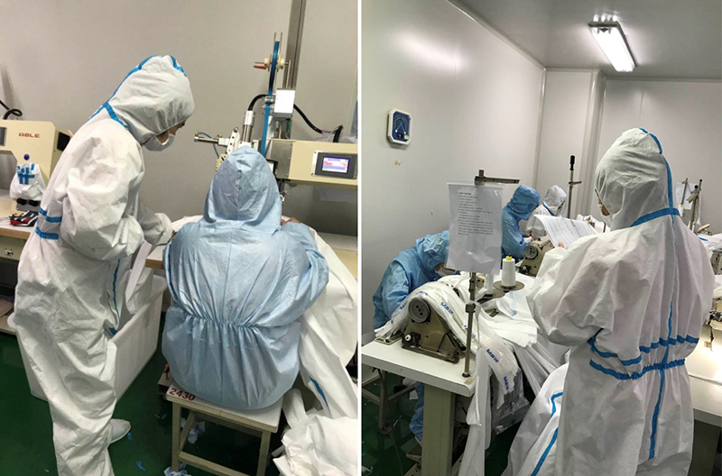 汤俊飞介绍说:“生产医用防护服与生产民用防护服是完全不同的,这是我从未接触的领域,所以我也在向专业人士学习。”医用防护服的生产不仅对于生产环境标准严格,需要按照无菌环境建设,将空气中的微粒子、细菌等污染物排除,确保制作时不受污染,而且在面料、工艺方面也有很高要求。从面料辅料的采购、打样,到调试机器、缝纫,每一项流程都要严格按照国家标准出发,尤其让汤俊飞及技术人员感到头疼的是对于缝纫的特殊要求,他们根据不同类型的面料经过不断地调整测试后,终于将胶条机调试成功。技术难关被逐个攻破,生产也进入加速阶段。