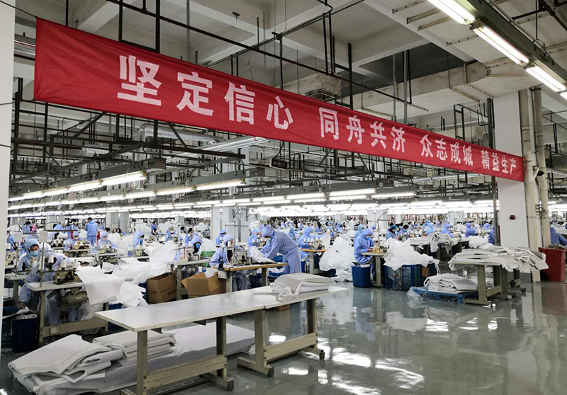 来自红豆西服厂党支部的共产党员汤俊飞积极响应公司党委的决定,在接到生产任务后第一时间回到工作岗位,投入生产筹备工作。她对车间进行实地查看,调试机器设备,协调面料采购,严格按照规定组织员工有序复工……从早上七点忙到夜里十一二点,仅仅两天时间准备工作就全部到位,并带领职工正式开启民用防护服的生产。