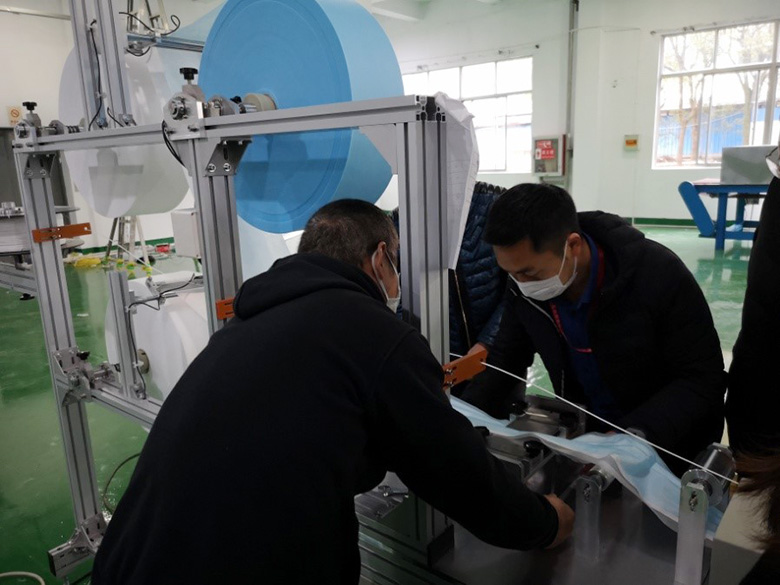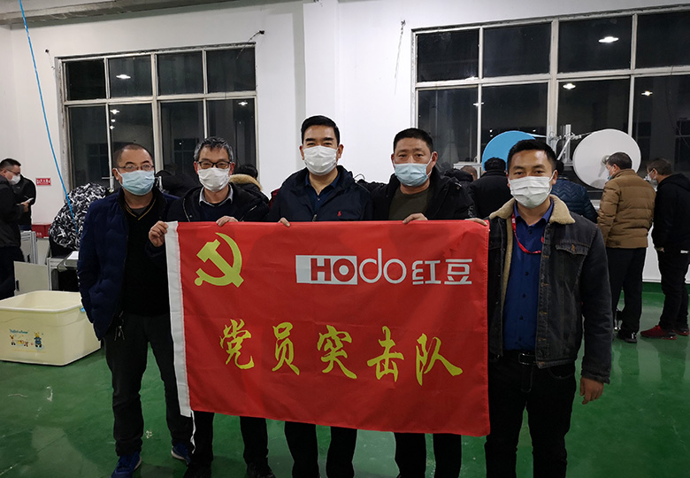今天随着两套全自动口罩生产设备运到工厂,红豆又将新添两条口罩生产流水线。红豆口罩党员突击队一马当先,在队长冯振标带领下,一呼百应,董建刚、戴宏、田勇、蒋国敏等党员干部冲在前,牺牲周末休息时间,加班加点连夜安装调试口罩生产流水线设备。