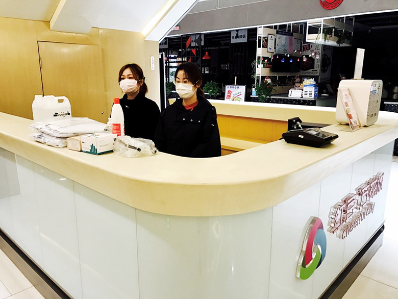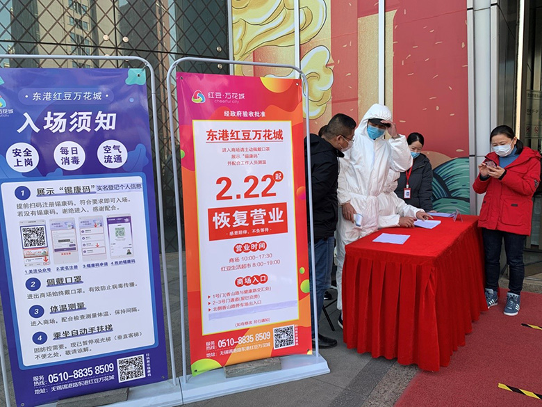 位于无锡的东港红豆万花城内灯火辉煌,遍布4层楼的大小店铺相继开门营业。“2月末,无锡中山路红豆万花城、东港红豆万花城恢复营业,我们按照政府相关规定要求进入商城的顾客必须佩戴口罩,配合测温、展示‘锡康码’。本月,我们分布在无锡及镇江的各红豆万花城商业综合体都相继恢复了营业。”2月27日上午,东港红豆万花城入口处,工作人员给两位客人边量体温边说,只见一边,消毒用品、洗手液、纸巾等一应齐全。