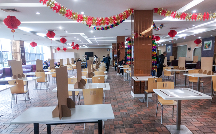 兵马未动粮草先行。在复工之前,公司利用现有资源通过各种渠道采购了大量口罩,防护服、酒精、消毒液等防疫物资也已全部到位。公司食堂实行人员错峰分流措施,员工就餐分时分批、限时限流,避免人员在食堂中聚集,进食堂前需检测体温,排队取餐需间隔一米,每桌限坐2人,中间用板隔开,且一律同向而坐,避免隔桌交谈。