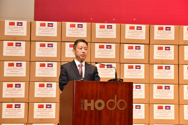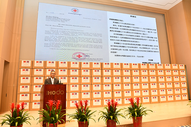 周海江在仪式上表示,在习近平总书记的亲自指挥、亲自部署下,我们举国上下同心抗疫,经过60多天的艰苦奋斗取得阶段性胜利。而在中国抗疫斗争初期最艰难时刻,洪森首相不顾危险,亲赴北京,雪中送炭,支持中国抗疫,体现了危难之际中柬两国的深厚兄弟情谊。多年来,在洪森首相的英明领导下,柬埔寨经济发展迅猛,现在柬埔寨疫情防控进入攻坚期,作为在柬投资的中国龙头企业,红豆集团用实际行动诚挚表达中国人民对洪森首相英明领导的一份敬意。