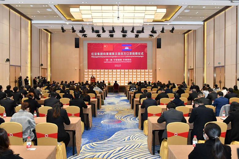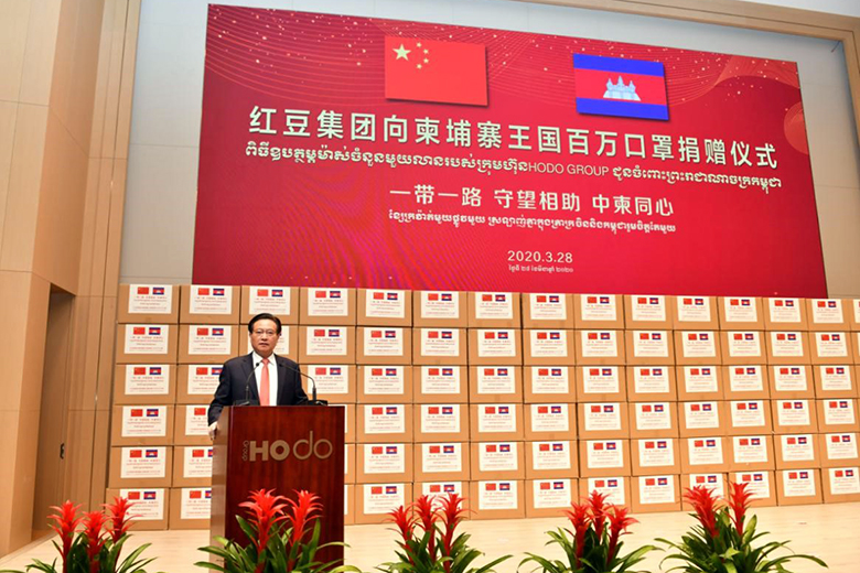 3月28日上午10点30分,红豆集团在无锡锡东红豆财富广场二楼举行了一场简单而隆重的防疫物资捐赠仪式——向柬埔寨捐赠100万只口罩。江苏省政协主席黄莉新、江苏省政协秘书长杨峰、江苏省工商联副主席李晓林、无锡市委书记黄钦、无锡市政协主席周敏炜、锡山区区委书记顾中明等省市区领导、柬埔寨驻上海总领事馆总领事田温楠和红豆集团董事局主席兼CEO周海江等出席活动。红豆集团副总裁、柬埔寨西港特区公司董事长陈坚刚主持仪式。