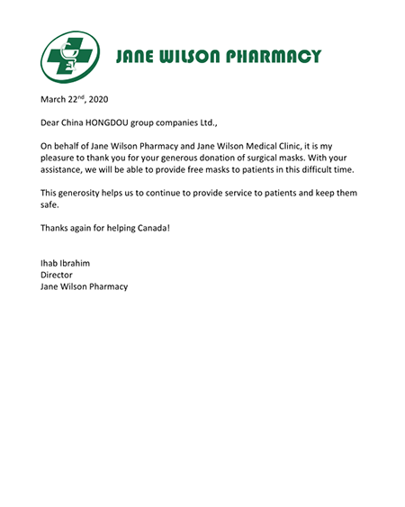 同时,红豆又向加拿大药店、警察局、诊所共捐赠1000个口罩,加拿大方给我们发来感谢信。