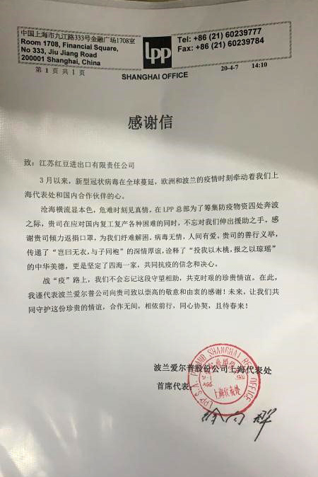 3 月中旬,红豆向波兰的这个客户返捐600个口罩,对方收到口罩后,表示感激,并写来感谢信,感谢红豆的雪中送炭。