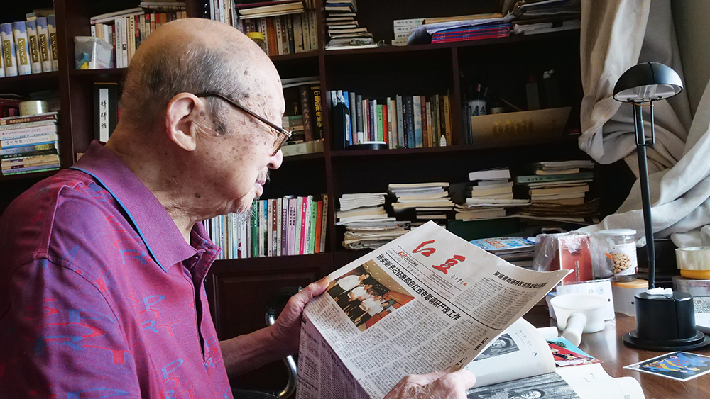 7月29日,今年的七夕前夕,当代著名老诗人、作家、文艺评论家丁芒在家中认真录制着对红豆七夕节20周年的祝福视频。中国当代诗坛曾有“北臧南丁”之说。丁芒,这位从南通城走出来的大诗人,从抗日战争的烽火开始生命的吟唱,80载笔墨为伴,书写了万余首激荡人心的诗篇。面对记者的拜访,丁芒和其夫人都十分热情。现已96岁高龄的他,看起来依旧面色红润,精神饱满。在丁芒老先生家中,能够感受到浓浓的文化气息,书柜上、书桌上摆满了各种书籍。虽然已是耄耋之年,丁芒老先生依然每天以书籍为精神食粮,在他的身上,我们看到了一个诗人对诗词的忠贞和热爱,对传统文化的敬畏和崇拜。