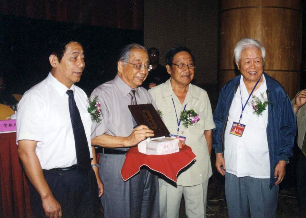 文化部原代部长、著名诗人贺敬之(右二),原中华诗词学会会长孙铁青(右一),红豆集团创始人周耀庭(左一)为刘征(左二)颁奖