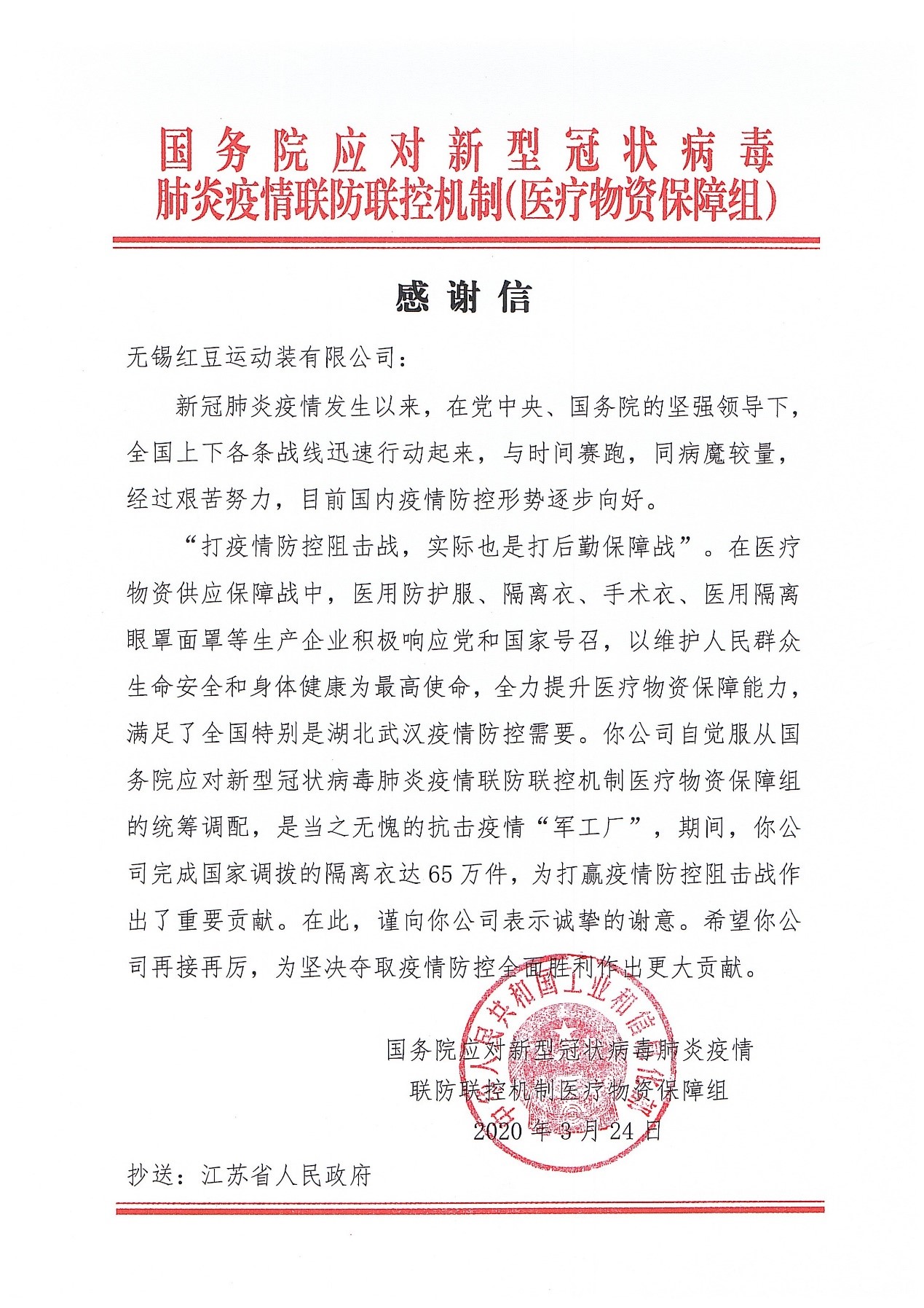 做大了的红豆,不忘担当和使命。在这次抗疫中,红豆集团党委书记、董事局主席周海江第一时间捐款1000万元个人特殊党费,是全国第一个捐款一千万元特殊党费的民营企业家。当时,战疫前线隔离服、防护衣紧缺,了解到这一情况,周海江连夜成立“党员突击队”,克服人员、原料、设备短缺等重重困难,夜日继夜带领大家改造生产线,转产抗疫物资。为了最快速度购买到设备,突击队员奔赴深圳,吃住在车上;当时正值春节员工放假,生产线上的员工都回家,没有人怎么生产?“我干过裁剪,我上!”“我干过缝纫机,我上!”党员干部纷纷请战,24小时不停工,连日连夜加班加点生产防护服隔离衣等紧缺的防疫物资。每天早晨七点钟准时发车,为前线送防疫物资。在2月份,疫情最紧张的时候,红豆送到武汉前线65万件隔离衣。
