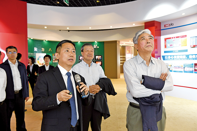 在红豆党建馆,红豆集团党委书记、董事局主席兼CEO周海江介绍了红豆创立的现代企业制度+企业党建+社会责任“三位一体”的中国特色现代企业制度、主题教育开展、企业发展等情况。周海江说,企业健康发展、企业人士健康成长,这是党和国家对民营企业的基本要求,也是广大民营企业的内在要求。红豆集团始终坚持党建引领企业治理,将党的政治优势转化为企业发展优势,始终坚持“听党话、跟党走,讲正气、走正道”,始终坚持“以人民为中心”的发展理念,不忘初心、牢记使命,致富乡亲、造福社会,实业报国、八方共赢。