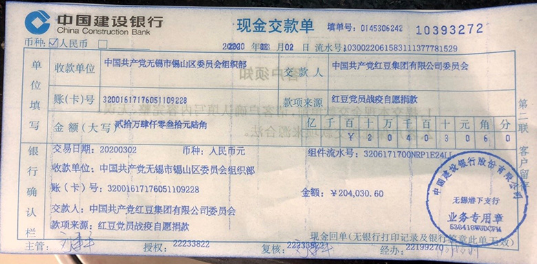 众志成城,方能共克时艰,为响应党中央、省委、市委、区委对广大党员的号召,助力全国共抗疫情,红豆集团广大党员干部迅速行动,踊跃捐款,用爱心凝聚合力,表达对新冠肺炎疫情防控工作的支持,到2月29日,红豆的1235名党员仅仅用了不到一天的时间,自愿捐款总金额达204030.6元。早在1月30日,刚从国外出差回来的红豆集团党委书记、董事局主席兼CEO周海江就通过锡山区委组织部向无锡市委组织部交纳1000万元特殊党费用于助力疫情防控。这次捐款他又是第一个行动,积极作表率。疫情防控没有局外人,党员干部们一致表示,在这个特殊时期,大家必须行动起来,既然不能到一线抗击疫情,就要在本职岗位上为疫情防控尽一份绵薄之力。