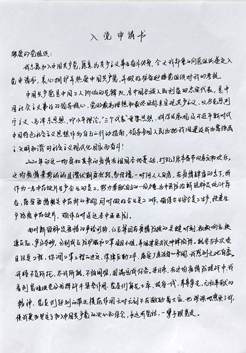 红豆集团国际公司的员工梁艳的再次向党组织递交入党申请书的原因很简单,“为了支持一线疫情防控,集团紧急组建党员突击队支援防护服、口罩生产线,负责最紧急、最艰苦的工作。我也报名了,因我还不是党员,所以没有把最重的任务安排给我。”受到身边党员的激励,让梁艳鼓起勇气,拟出了这份“疫情火线入党申请书”。