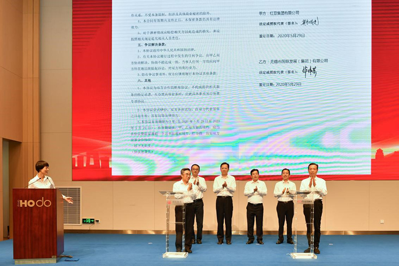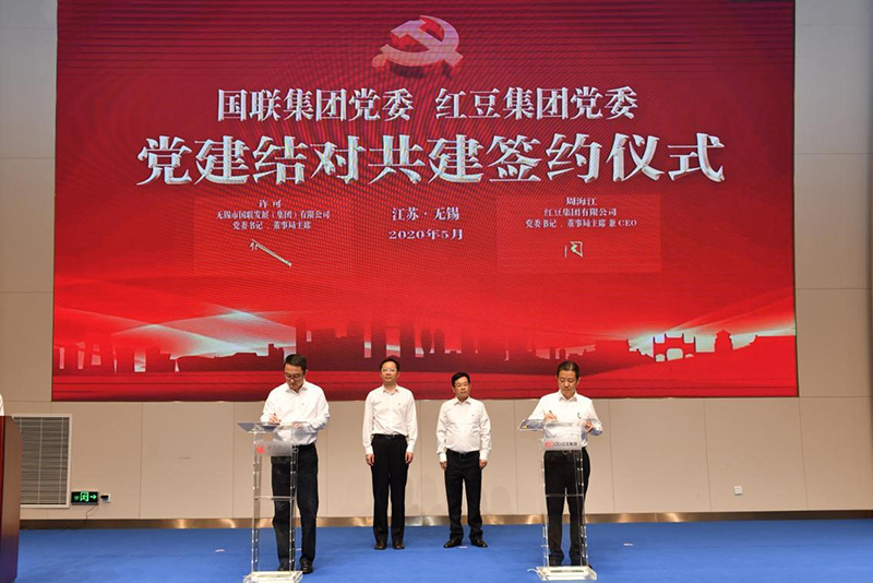 仪式上,红豆集团党委书记周海江与国联集团党委书记许可签订党建结对共建协议,红豆集团董事局副主席龚新度与国联集团党委副书记、总裁华伟荣签订战略合作协议。